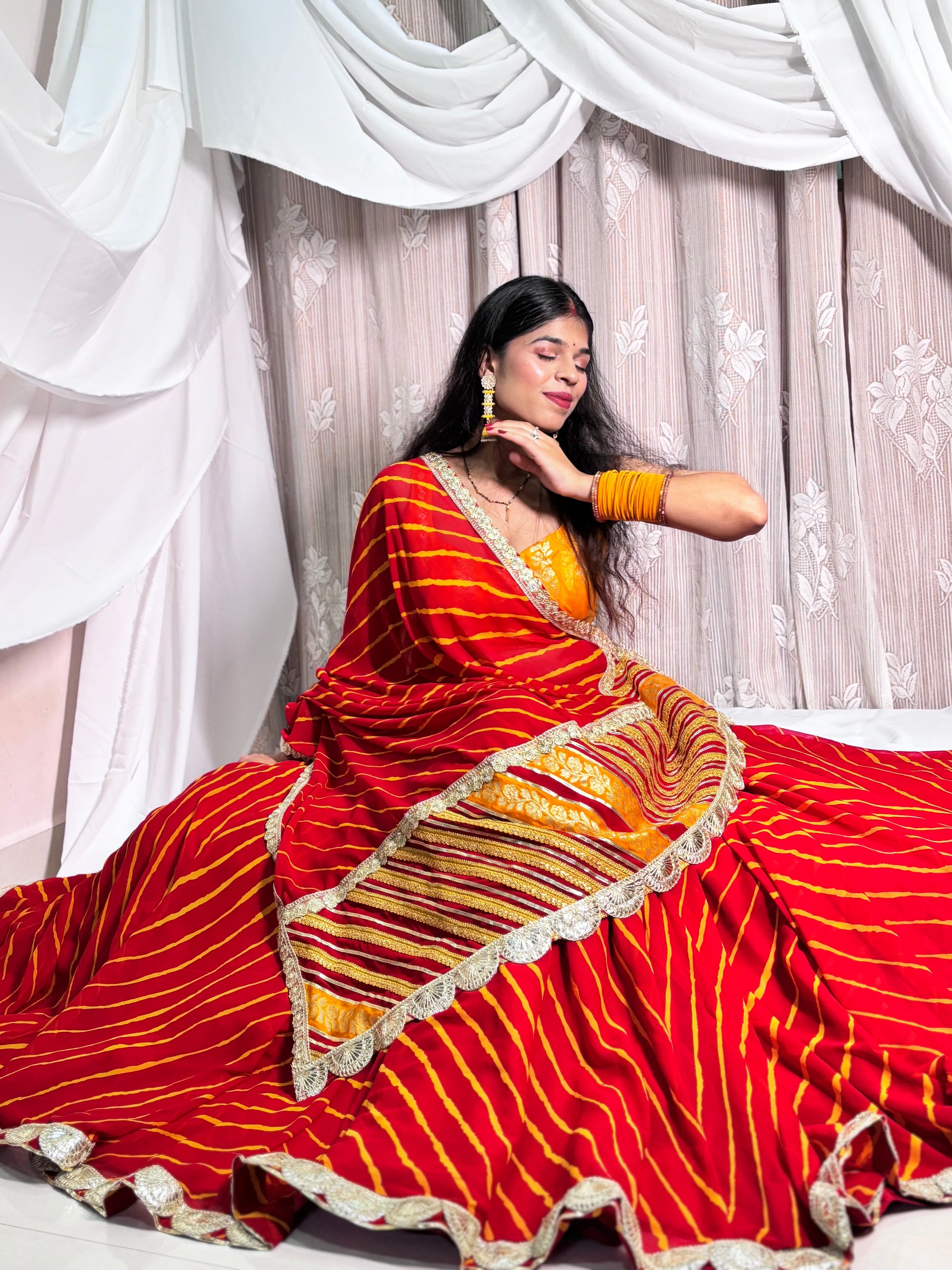 Be the centre of attention with our Leheriya Lehenga. Made with high quality Fabrics and designed to perfection with love and care.